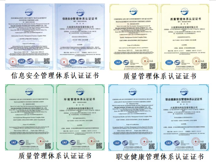 近日,經(jīng)過第三方權威認證機構嚴格考察和審核,大連國訊科技發(fā)展有限公司順利通過ISO14001環(huán)境管理、ISO9001質(zhì)量管理、ISO45001職業(yè)健康安全管理、ISO27001信息安全管理及ISO20000信息技術服務管理等五項體系認證,成為我市少有的獲ISO五項體系認證的高科技創(chuàng)新企業(yè)。同時,公司還獲得權威機構頒發(fā)的AAA級信用企業(yè)、誠信經(jīng)營示范企業(yè)、售后服務誠信認證企業(yè)及質(zhì)量服務誠信企業(yè)等稱號。